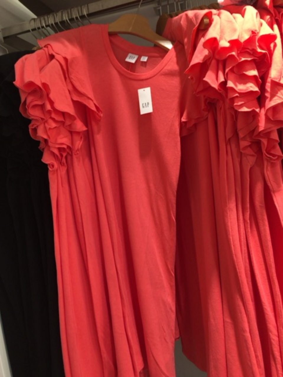 御殿場プレミアムアウトレットにあるGAP. 綺麗なカラーのお洋服が 並んでいます。Tシャツの生地で、袖に同素材のフリルが付いているワンピースが目に付きました。ブラックやオレンジは これから夏の旅行シーンで活躍できそうです。