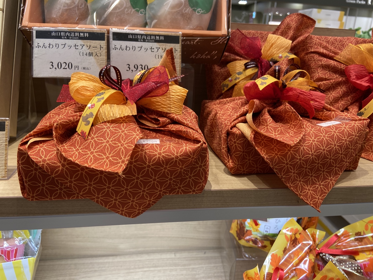ゆめタウン徳山店の1階にる山口で有名なお菓子屋さん『果子乃季』さんです。自分ん用にクッキーシューや、アップルパイ等購入しますが、こちらにはラッピングが素敵なプレゼント用のお菓子も充実しています。今は秋らしいラッピングでした。