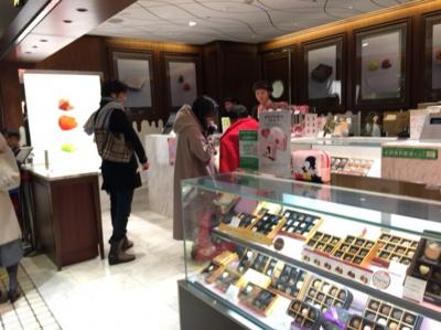 ジョイナス1階にあるキルフェボンさん。店内はいつもお客さんがいっぱいですが、スタッフの方が手際よくさばいて番号札をもらって待ちます。カウンターで 可愛らしい箱の中の品物を確認します。そんなに待たずに買えます。今はイチゴの商品が たくさん並んでいました。