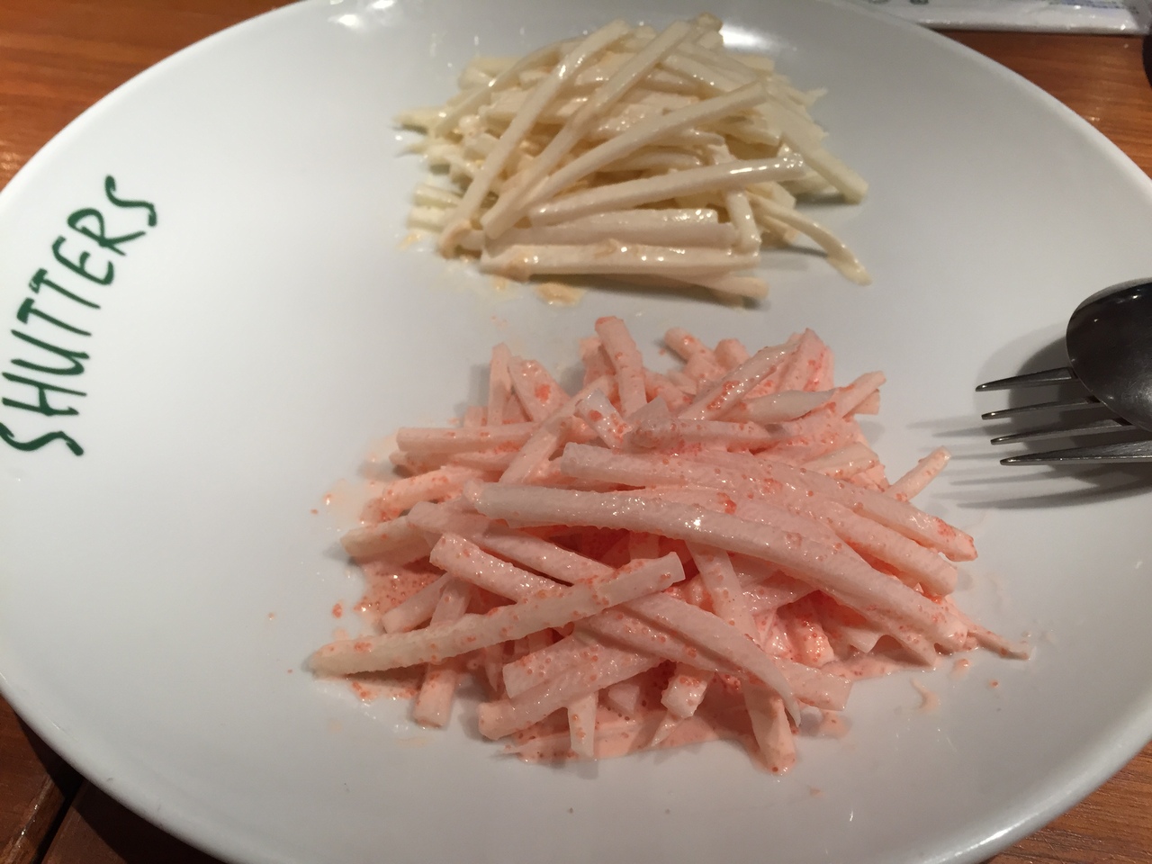 金曜日の夜 予約なしだと少しキツイと思います。総勢5名だったのでまずはビールのピッチャーを頼みました。グラスも冷え冷えで美味しかったです。大根サラダは太めの千切りでマヨネーズと明太子が絡んで美味しかったです。名物のスペアリブ色んな味を数種類注文 どれも柔らかくて美味でした。パスタなどもあり、ワインやビールが進みました。桜の季節なら満開の桜を見ながらお食事が出来るんだろうなぁ。