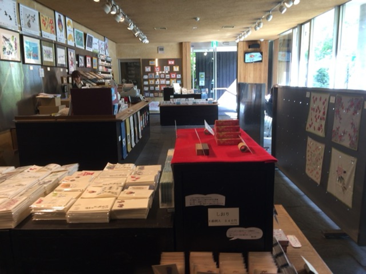 草津温泉の街中散策途中(西の河原公園の手前です)にひときわ綺麗な建物があります。片岡鶴太郎美術館に併設されてるショップにカフェコーナーがあります。通りの方に向かって10席?ほど座れるカウンターです。ショップには何とも可愛らしいお顔の七福神や、ドーンと印象的な魚や虫の一筆箋やファイルなどのグッズも売ってました。ホットコーヒーで一息ついて また散策開始です。