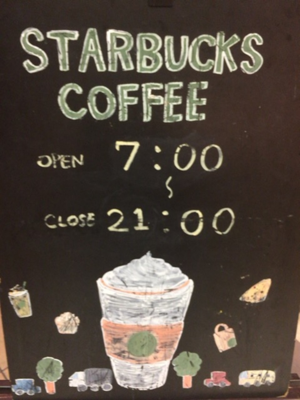デザートを探していたらスターバックスが有ったので、写真入りの一押し的な季節のおすすめの チョコレートケーキ トップフラペチーノ ウィズ 抹茶ショットを。店内に明日もありますが、外の椅子で 風が気持ちよかったです。営業時間は7:00~21:00です。