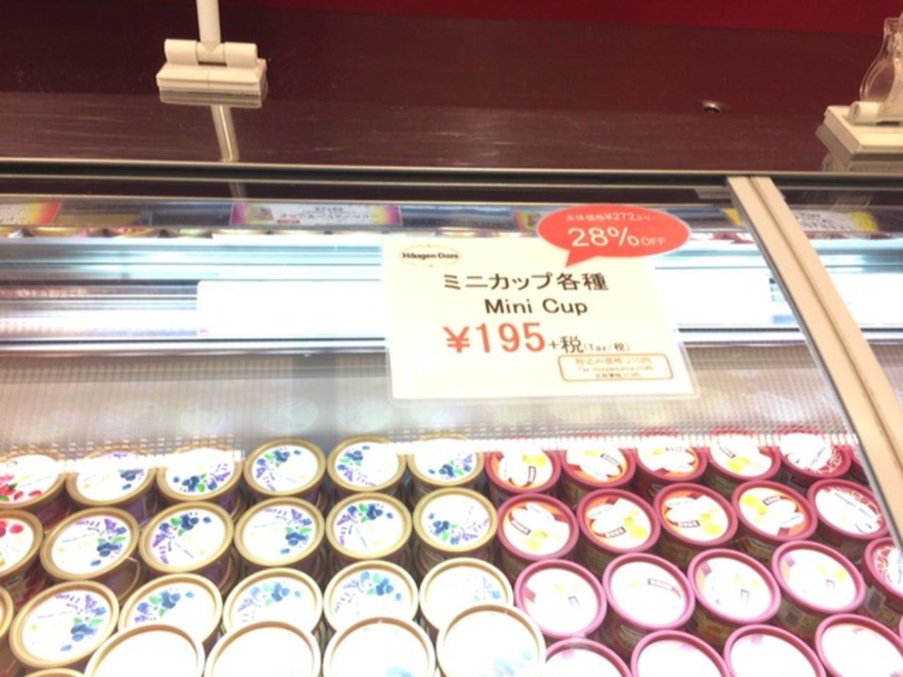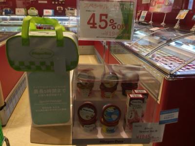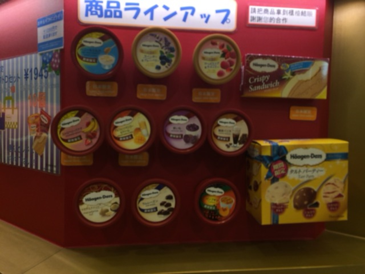 御殿場アウトレット内にあるハーゲンダッツへ。スーパーやコンビニで販売されてるサイズならカップが一つ195円(税別)で売られており、28%オフになるのだそうです。小さい店舗ですが種類は沢山あります。持ち帰り用には、可愛らしい保冷バックにいろんな種類のアイスが入ったスペシャルセット1945円(税別)がありました。1200円で配送もしてくれます。