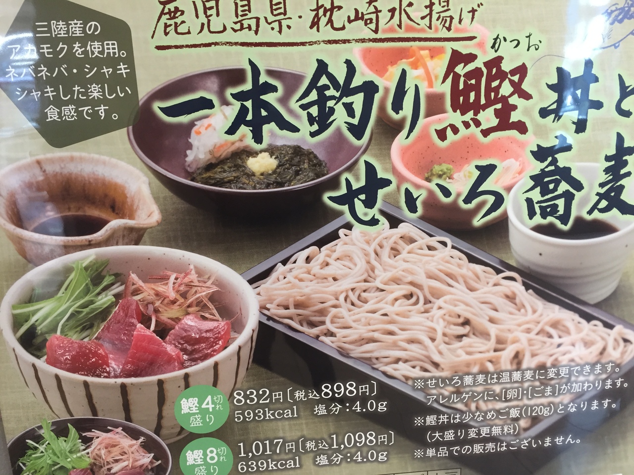五反田駅東口にある大戸屋さんへ。朝の7時~夜の11時まで空いているようです。なにを食べようかなーって思っていたのですが、期間限定メニューの看板があったので即決。鹿児島の枕崎だとれた鰹とお蕎麦です。頼むしかないですよねぇ。大戸屋さんは外食が多い人にとって、ヘルシーメニューがあるので、本当に罪悪感なく頂けてありがたいです。