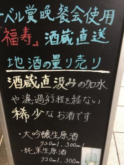 有楽町駅前にある東京交通会館の1階にあります。全国の色んな名物が揃っており ソフトクリームが人気のようですが、私のお目当はノーベル賞授賞式に提供されていると言う神戸のお酒『福寿』です。山中教授が医学・生理学賞を授賞された時に知ったのですが、どうやらその前から提供されていたようです。ボトルも濃い青でなんか重厚な感じがします。