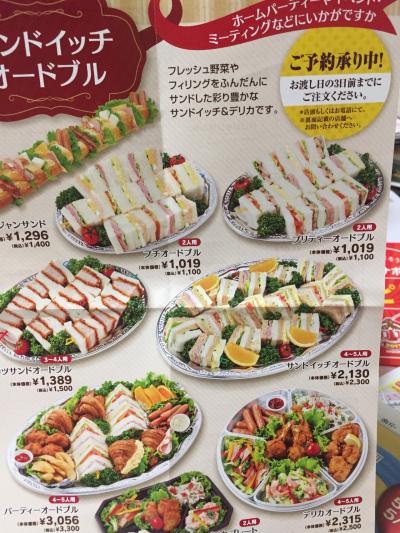 お友達宅でのホームパーティーのお待たせ用のサンドイッチやオードブルを予約するためにお伺いしました。長いフランスパンに切り込みを入れて、ハムやチーズなどを挟んだパリジャンサンドを、何かで見て 気になったので。でも実際店舗に行ってチラシを貰ったら 色々なサンドイッチや、デリカプレートがリーズナブルなお値段であり 大満足です。予約は3日前までなので ご注意を