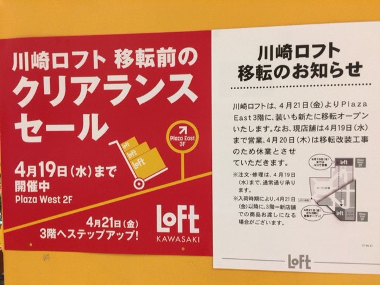 ラゾーナ川崎2階にあるロフトが4/21に3階のビックカメラ横に移転するにあたり 移転前クリアランスセール(4/19まで)やってるので 行ってきました。一部の時計や、リュック系のカバンなど半額になっていました。お誕生日カードなどの定番のカード類は30%で何種類か購入しました。その他ワゴンにお買い得品が並んでおり 自分の好きなものが安くなってたら超嬉しくなりました。