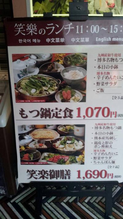 福岡でお昼にもつ鍋を食べたいと 笑楽に来ました。場所柄観光客の方が多いですが、スーツ姿のビジネスの方も沢山いらっしゃいます。定食を注文すると、小鉢、明太子、サラダなどが提供されます。しょうゆ味のもつ鍋登場 もちろん美味しいです。締めはゴハン(100円)もありますが、今日はちゃんぽん麺(300円)を。おなかいっぱい ご馳走様でした。