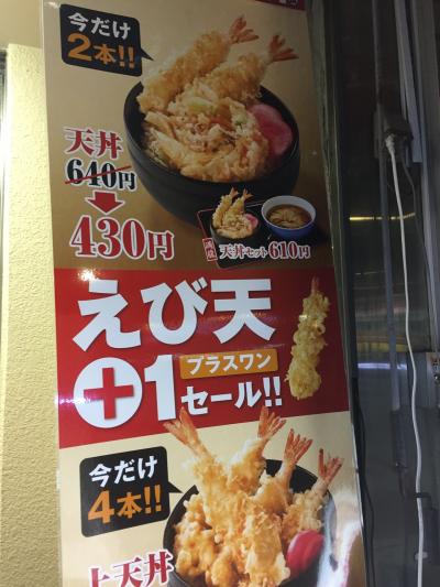夕方早めの時間にお腹が空いたので 夜の食事の事を考えた時 ハンバーガーなどのファーストフードも思い浮かんだのですが 今日は小諸そばさんへ。店頭に 今だけ 海老2本 天丼640円→430円の表示を見て これは食べなければと