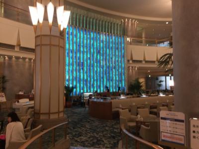 ロビー階のラウンジ クリスタルムーブメントにてら開業20周年記念で アフタヌーンティーセット 3564円が2500円になるお得なセットを頂きました。ホテルオリジナルの紅茶さくらいろと言うのもセレクトショップ可能でした。奇抜な感じのカーペットと、青いたきを模した様な壁が印象的でした 壁がないのに、静かな雰囲気の良いラウンジでした