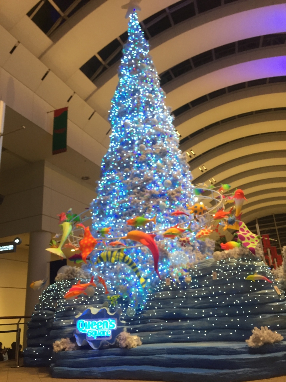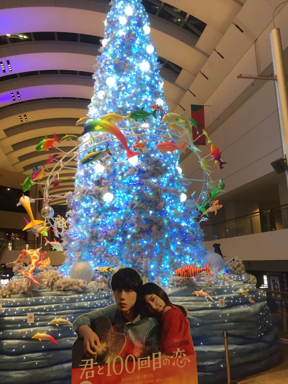赤レンガ倉庫でクリスマスマーケットを見に行った後 桜木町まで歩いて帰るの途中 クイーンズスクエアに寄り今年のツリーを見て来ました。今年は坂口健太郎さんの映画 [君と100回めの恋』とコラボした海洋生物たちがキラキラと舞うファンタジックなツリー らしいです。実際 ニモ?的な 冬らしくないが、快活な海のイメージの素敵なツリーでした。