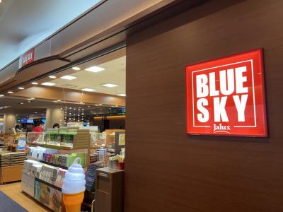 羽田空港 JAL側の11番ゲートのところにある、ブルースカイさんです。羽田空港ターミナルビルにはものすごくたくさんのお土産物屋さんが有りますが、こちらのショップは、搭乗する最後の最後まで、買い忘れなどある場合助かります。
