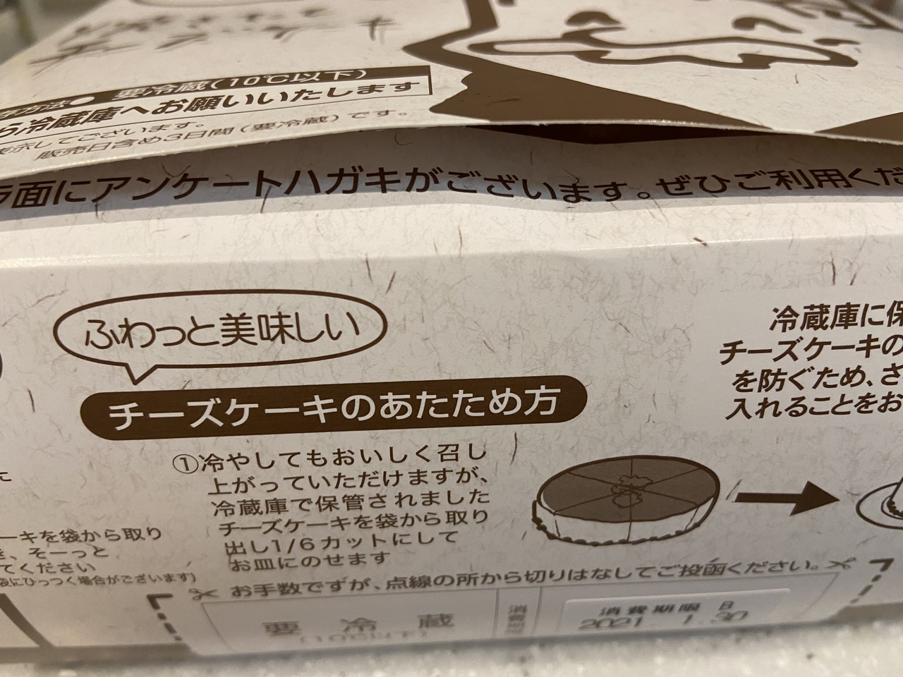 大好きなチーズケーキのひとつ りくろーおじさんのチーズケーキです。賞味期限が3日あるので、その点も良いです。箱にはチーズケーキの温め方など、食べ方のアドバイスも書いてあります。とは言うものの、いつも常温ですぐに食べ切ってしまうのですが(笑)
