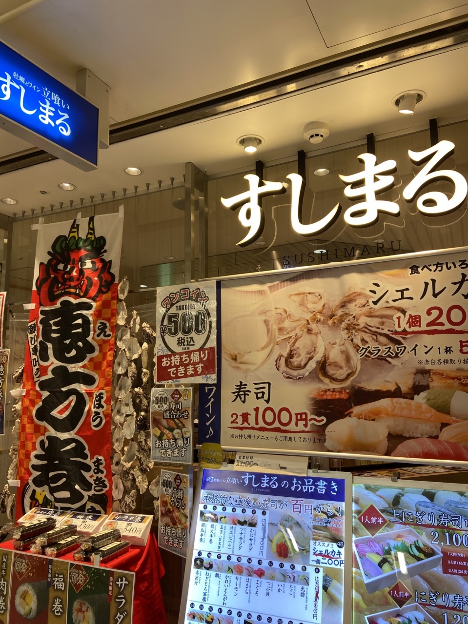 なんばウォークにある、かきとワインすしまるさんです。ワンコイン500円の握り寿司や、ちらし寿司テイクアウトがお得なのですが、今日は節分なので、巻き寿司を購入しました。3種類の恵方巻が店頭に並べられており 名前が良い福巻をいただきました。