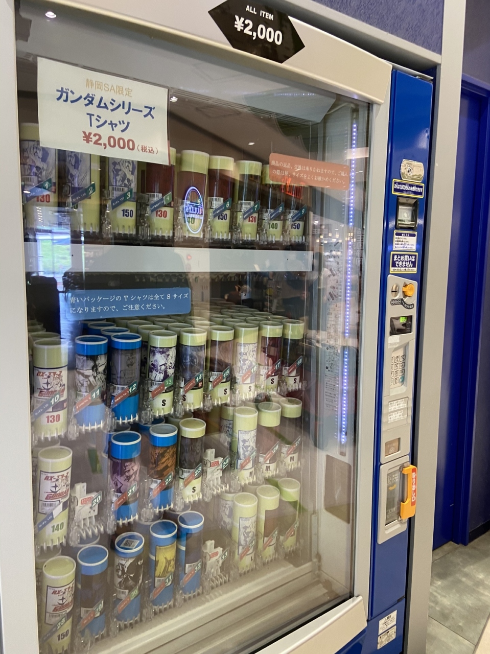 新東名高速道路 静岡サービスエリアです。機動戦士ガンダムとコラボしているみたいで、展示物や、限定品の販売、自動販売機でTシャツなども販売していました。フードコートも大きめで、中華、ラーメン、丼もの、トンカツなど幅広い種類の店舗がありました。