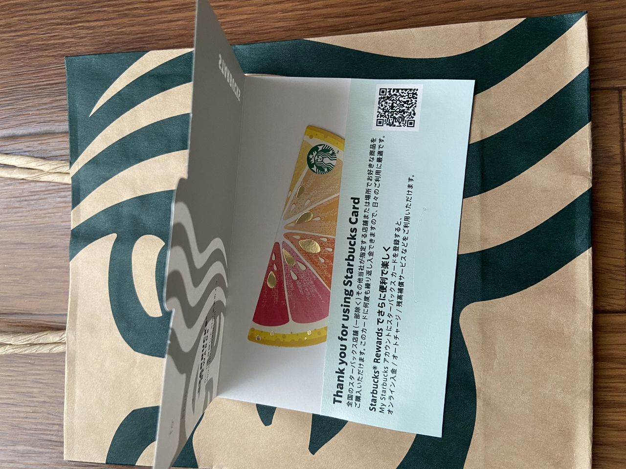 お世話になった知り合いの方へのプレゼント用にスターバックスのカードを購入しに行きました。チャージする金額が色々選べるのでとても都合が良いです。カードのデザインも色々ありましたが、夏らしいものを選びました。カード用の封筒や、紙袋はまだ今も無料で頂けました。軽くて、賞味期限を気にすることもないし、助かります。