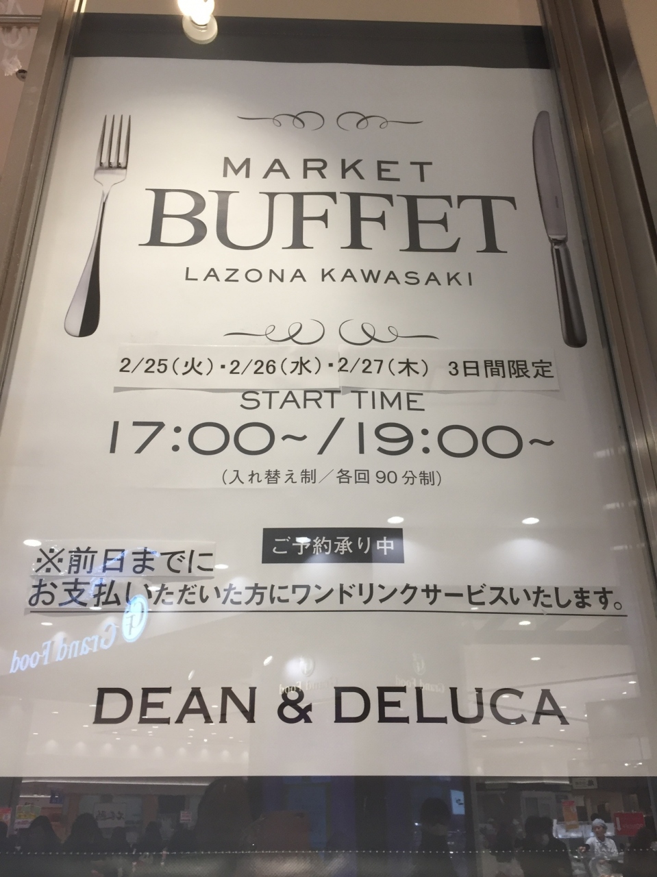 たまに開催されるブュッフェが次回は2月25日、26日、27日に開催されます。予約してお代金を払うと特典としてワンドリンクサービスがあります。100グラムがなかなかお高いこちらのデリを食べ放題なんてお得感満載で、お腹ペコペコでいきまーす。