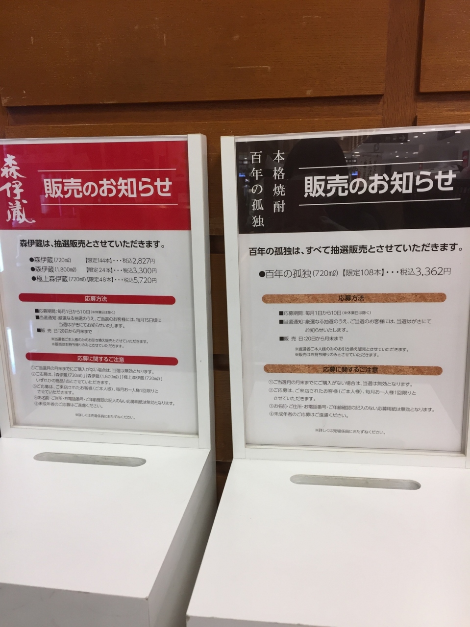 高島屋にお買い物に行った時に 地下のお酒売り場で人だかりがあり、気になって近くに行ってみたら、人気の焼酎の抽選販売の申し込みでした。前から気にはなっていたので、早速私も応募しました。『森伊蔵』と、『100年の孤独』が買えるみたいです。当選すればいいのになぁ~