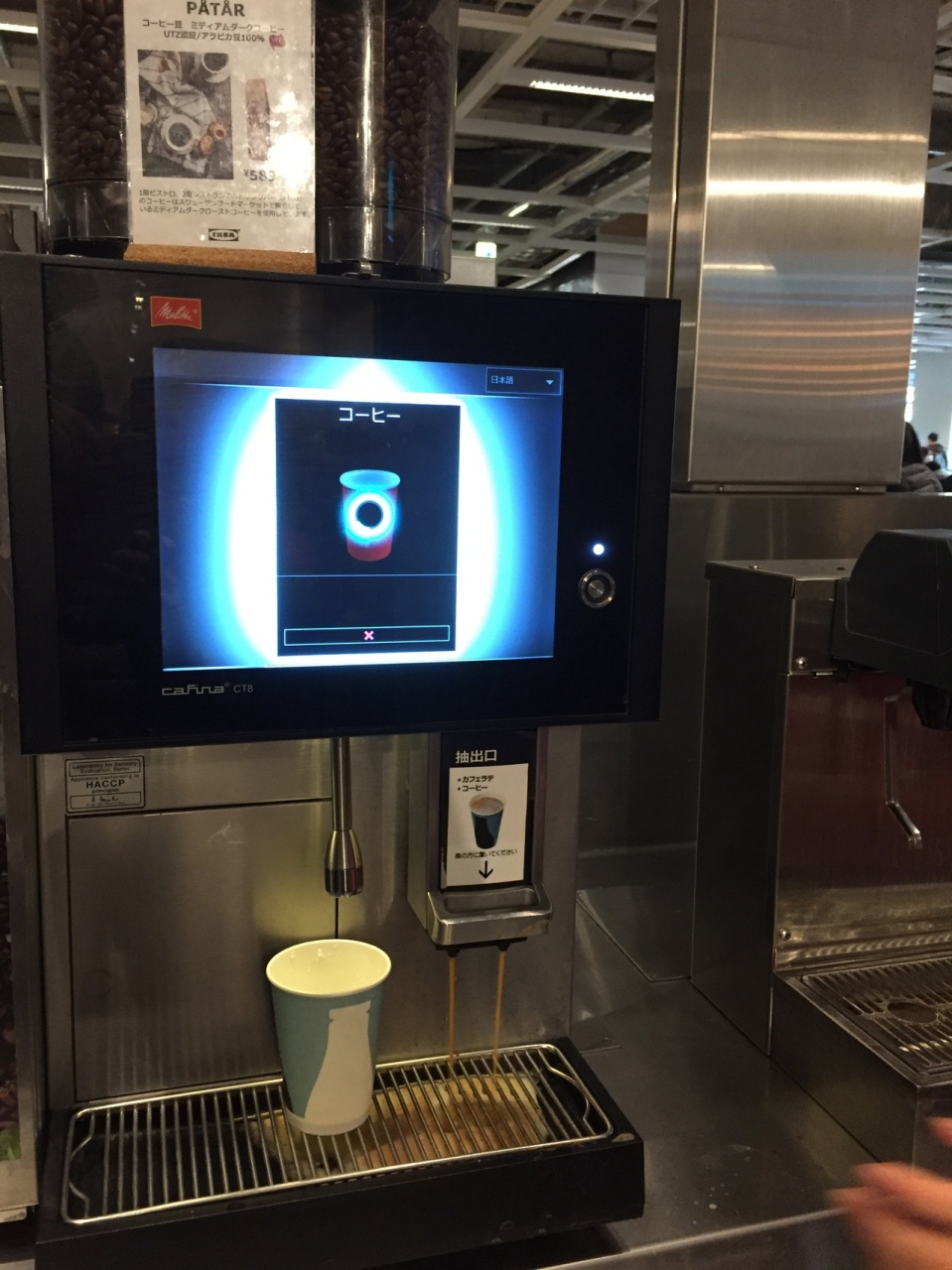 IKEAの店内をくまなく見倒し、お買い物した後は 小腹が空いたところで 1階の簡易なカフェに行きます。ホットドッグ100円 コーヒー100円 ソフトクリーム50円をいただきます。レストラン同様 お席の確保が大変ですが。