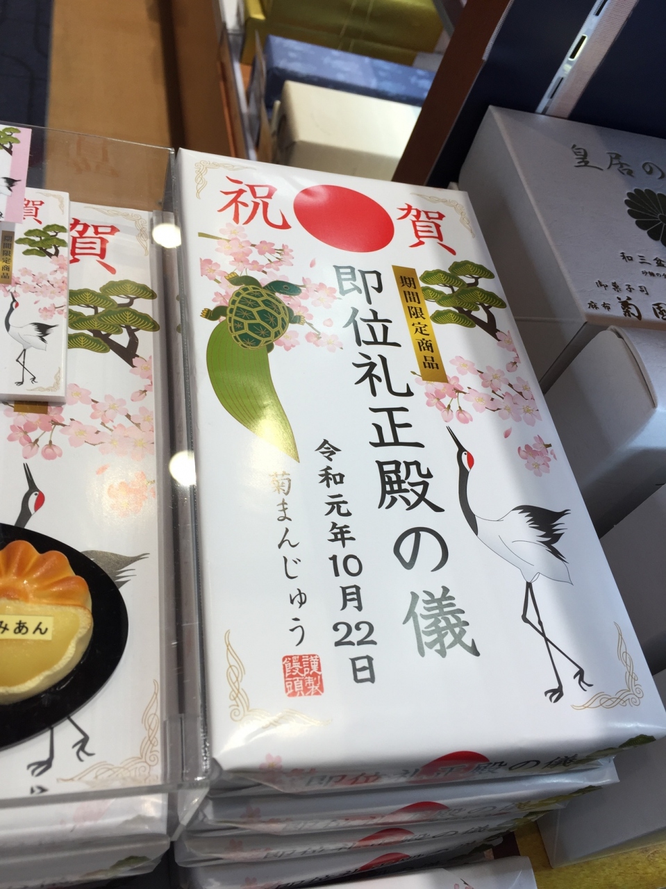もともと 皇室関係の お菓子は売ってたので、気にはなったましたが 今回 [即位礼正殿の儀まんじゅう ]を発見しました。しかもちゃんと10月22日の日付入りです。1つ購入したのですが、お友達に差し上げたら、喜んでもらえたので、数個購入すれば良かったと後悔しています。