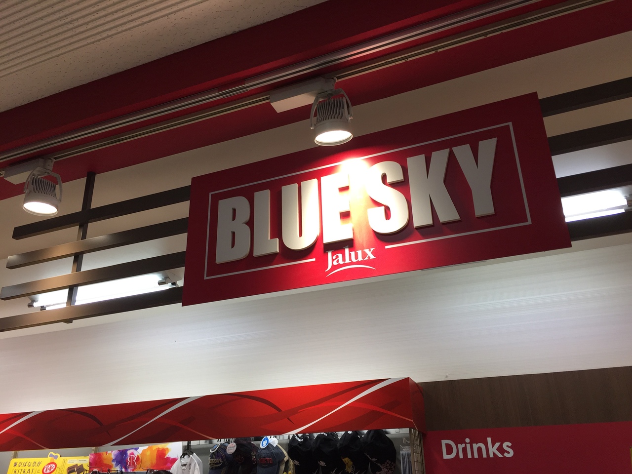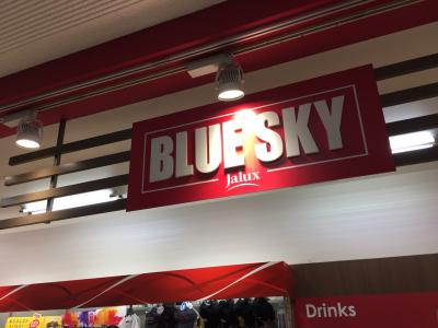 成田空港第二ターミナル 到着ロビーにあるJALの直営のブルースカイです。羽田空港とかと比べて コンビニ色が強いショップです。前にJALエービーシーというスーツケースなどの宅配のうけつけカウンターがあるので、そちらに預けて その後こちらでペットボトルなどを購入できるので便利です。