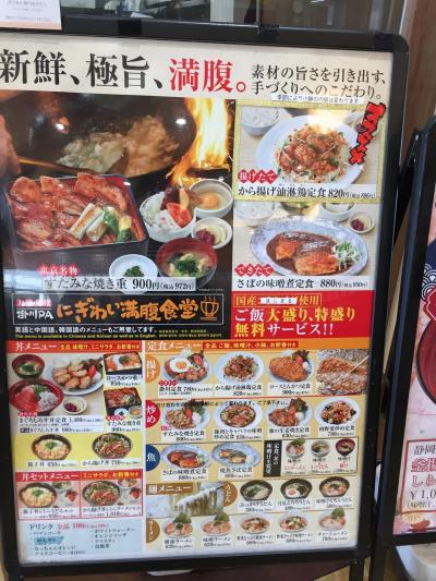 新東名高速道路 上り線 掛川PA内 フードコートにあるお店です。以前は釜揚げ桜えびとしらすの海鮮丼を頂いた記憶があるのですが、メニューをよく見たら ガッツリ系の定食屋さんだったようです。ご飯も大盛り特大、特盛らが無料サービスと書いていました。どうりで注文カウンターには若い男の方が 多かったんですね。