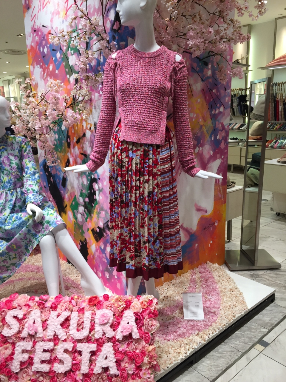 銀座の老舗デパートの松屋です。エントランスに SAKURA FESTA と綺麗なお花のでデコレーションしてあり、とってもステキなコーディネートが展示してありました。特にスカートがステキで 3階の婦人服に速攻で探しに行きました。実際に購入出来るのがいいですね。