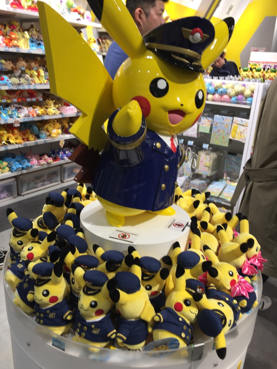 成田空港第二ターミナル4階南側のエスカレーターの横にあります。ポケモンストアはあちこちで見かけますが、成田空港にもあったんですね。空港店らしくポケモンストア機長さんのお洋服でした。お客さんは海外の方の姿も多かったです。