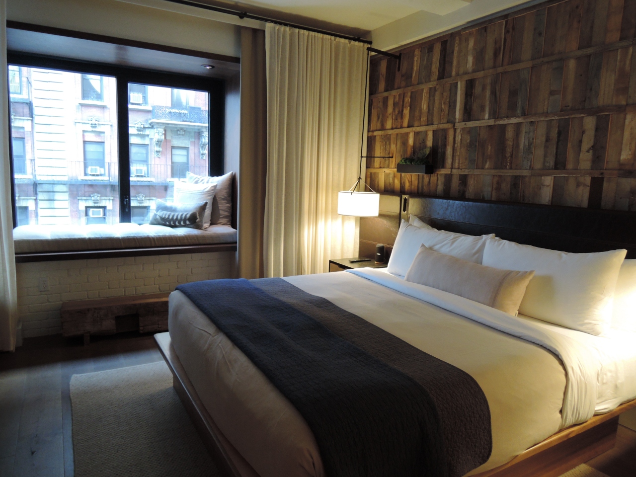ホテルはデザインにこだわったおしゃれなホテルで木を基調とした内装はセンスの良さを感じます。客室はそれほど広くはありませんが、スーツを広げにるには十分は広さがあります。ニューヨークのホテルはそれなりのホテルでも浴槽が無いことが多いですが、部屋のタイプにもよりますが、浴槽付きの部屋もあります。- 旅行時期
