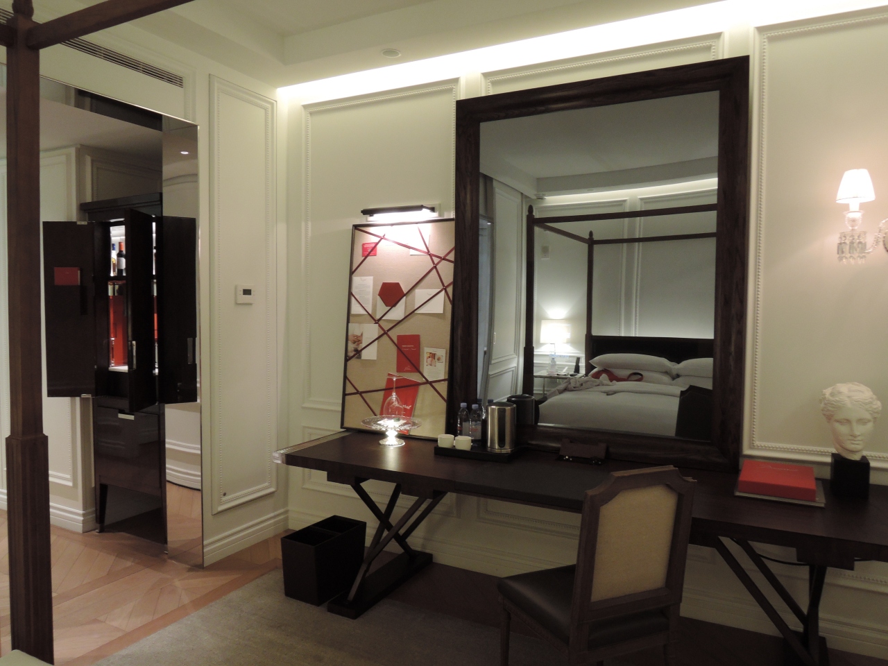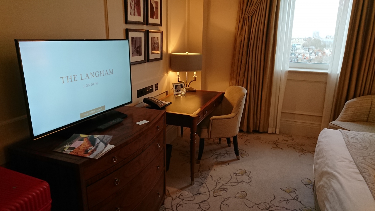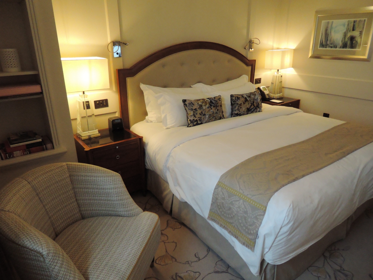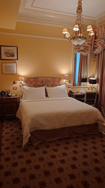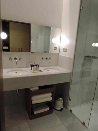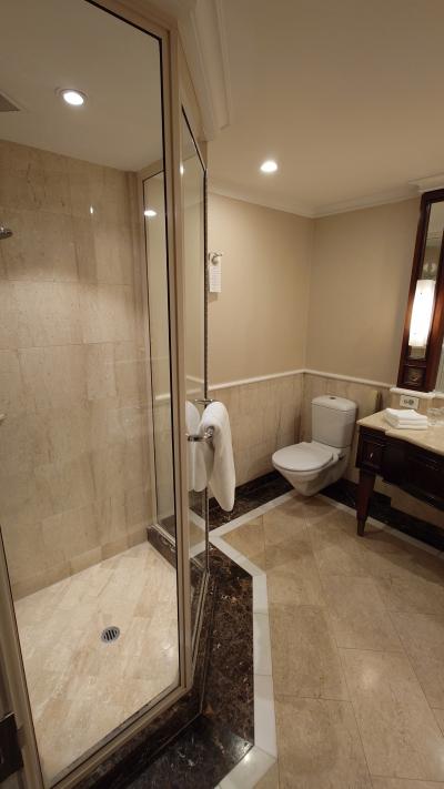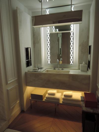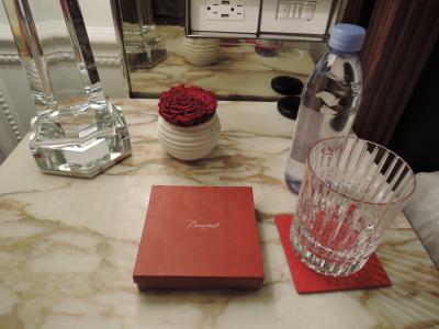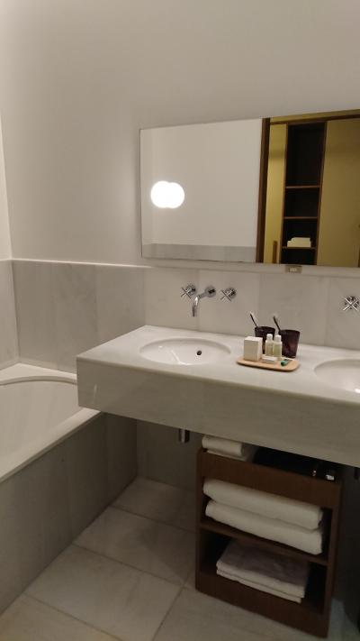 客室はスーツを広げるのに十分な広さがあり、きれいで快適です。ウエルカムドリンクの他、ウエルカムマカロン、ウエルカムチョコレートも置いてありました。バスローブやスリッパ、アメニティーグッズもそろっています。- 旅行時期