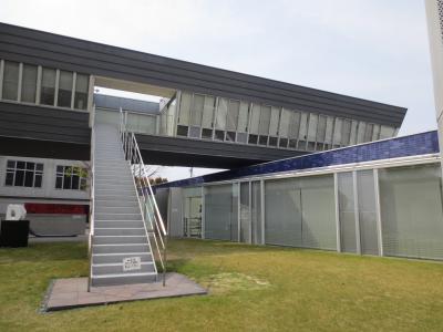 建築家・長谷川逸子の設計で、細い柱で支えられたピロティ上の建物が特徴的です。