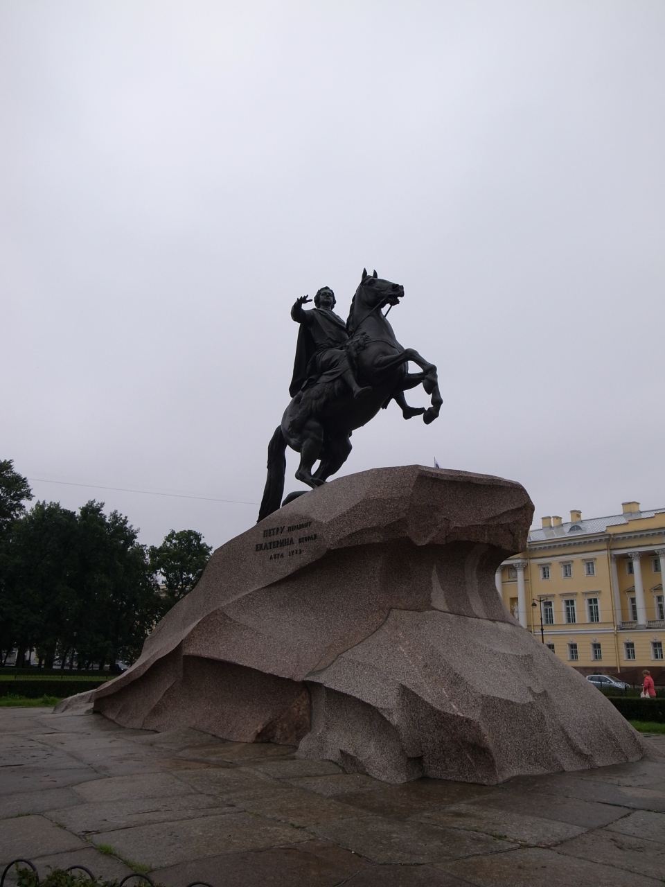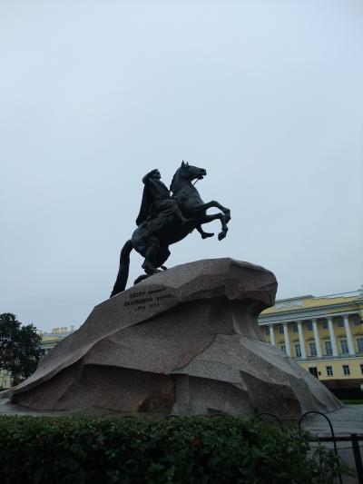 この広場から青銅の騎士像やイサク聖堂、ネヴァ川など主要な名所を広く見渡せます。広場の中央にあるピョートル大帝像の「青銅の騎士像」は特に見ごたえがありますね。近くで見ると勇ましい姿をより強く感じました。