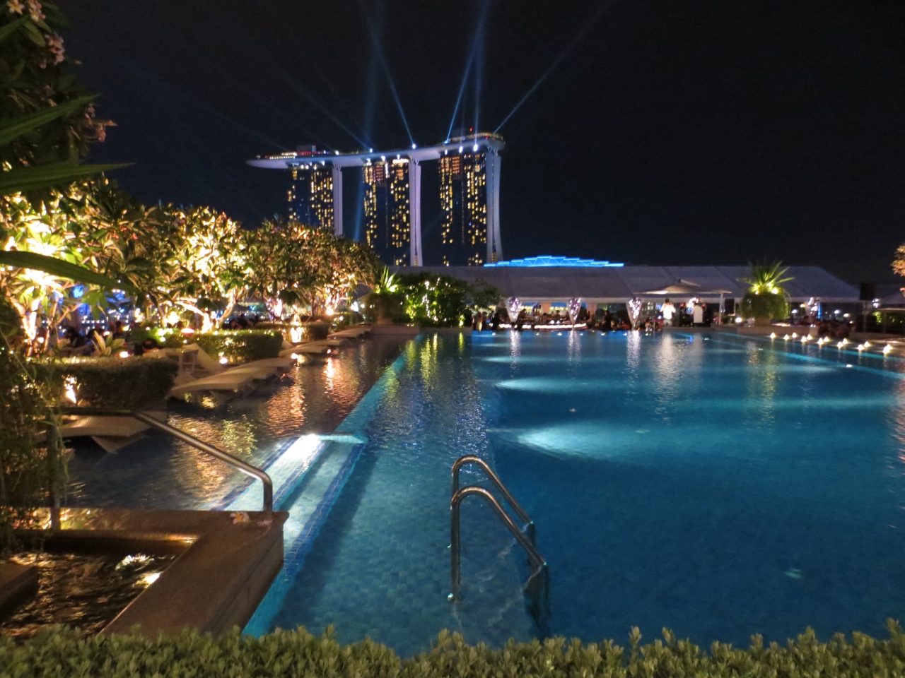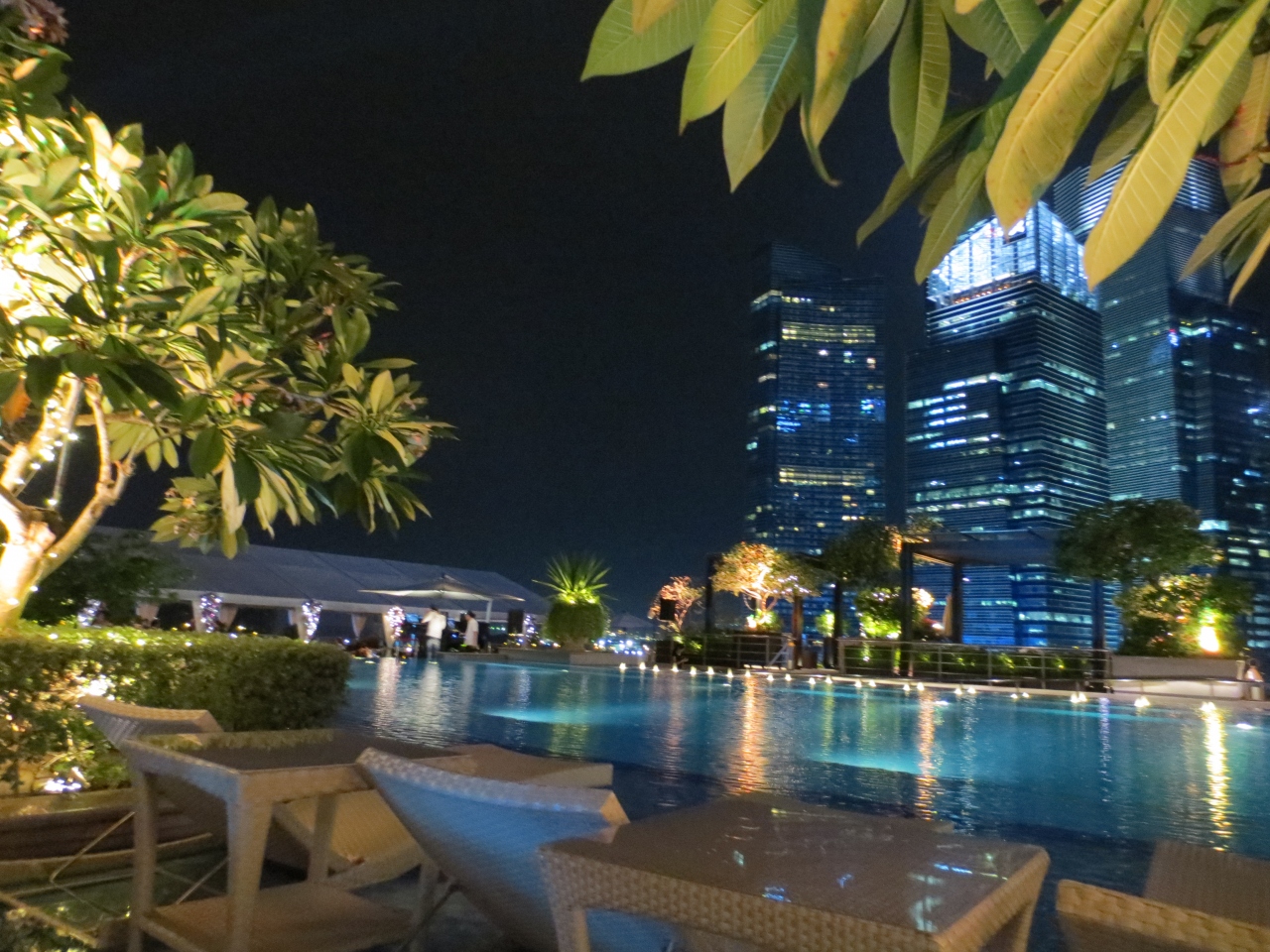 ラッフルズ・プレイス駅から5分ほどのホテル・フラトンベイの屋上にあるバーで、ここからの夜景が何とも言えません。