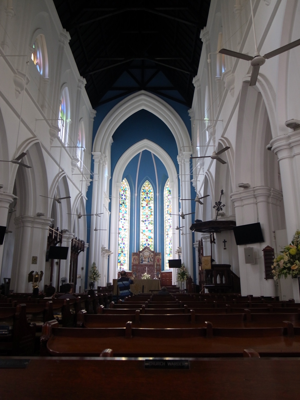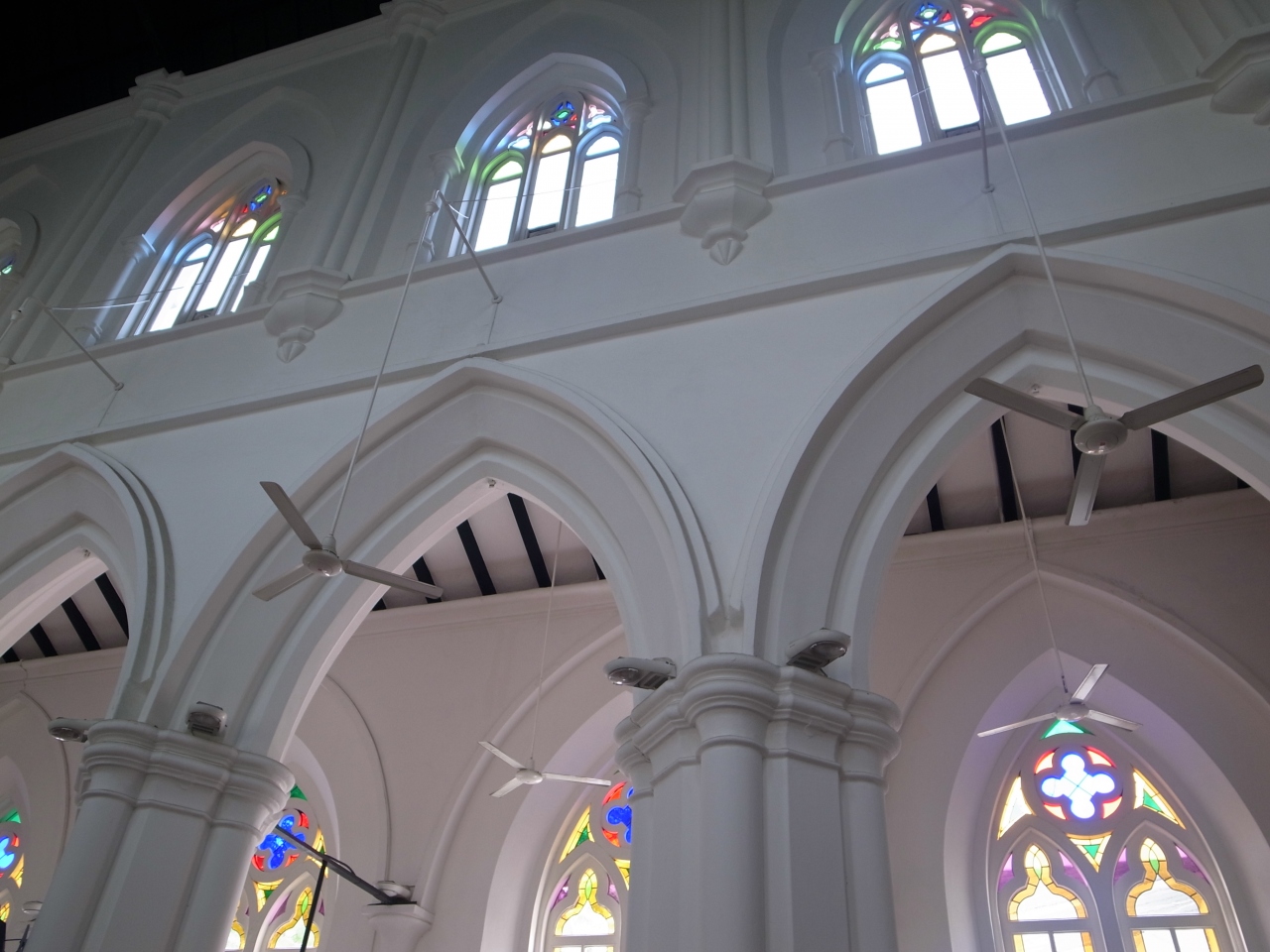 外観は純白のきれいな白い建物。内部はステンドグラスが美しい神秘的な空間です。