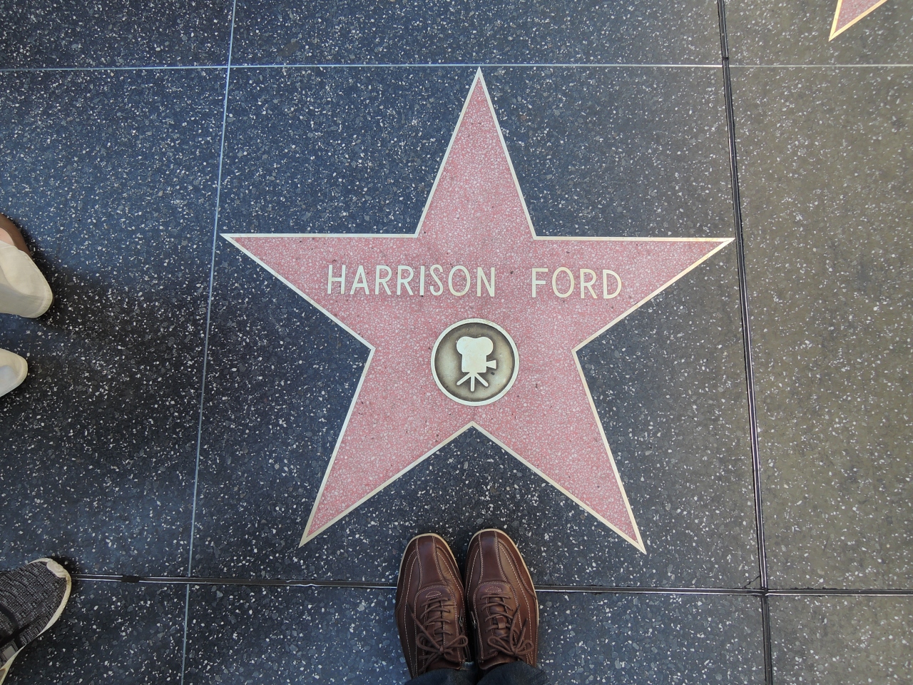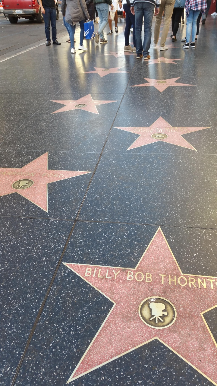 ハリウッドの街中の歩道に無数の星型が並んでいます。それぞれの星型に有名なハリウッドスターの名前が刻まれていて、お気に入りのスターの星型に足を揃えて、みなさん記念撮影しています。