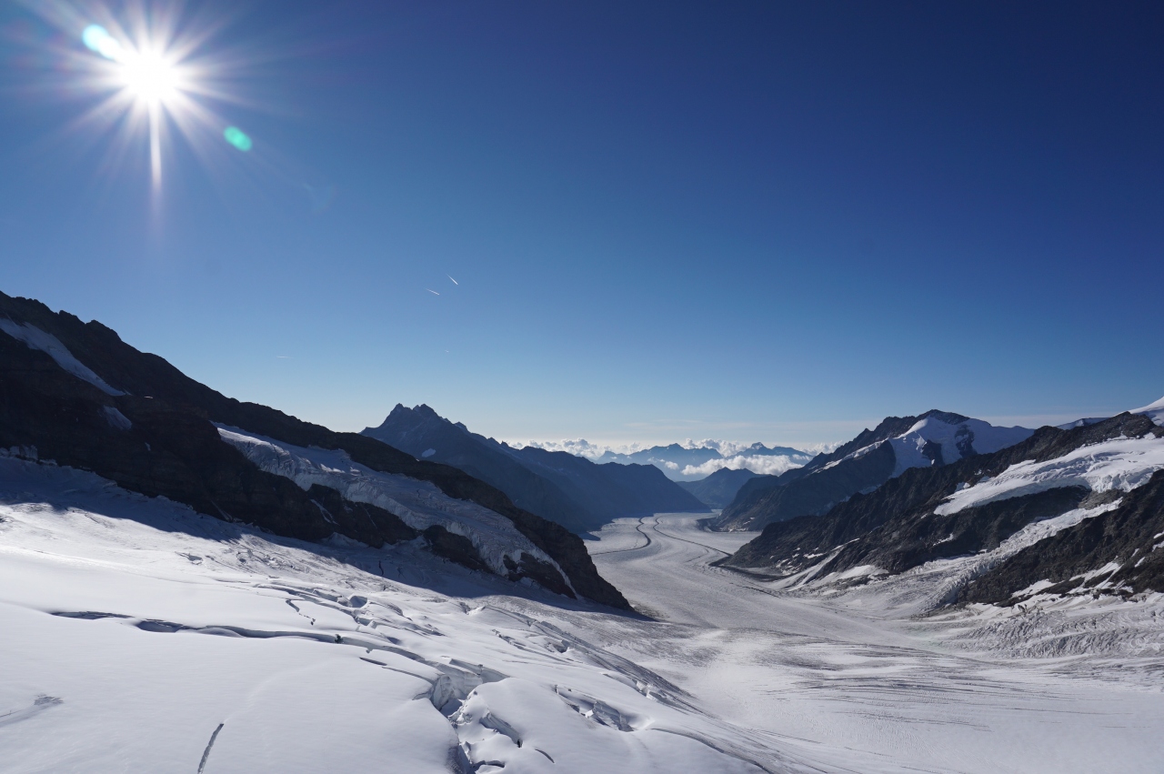 インターラーケン オスト駅からオーバーラント鉄道、ヴェンゲルンアルプ鉄道、ユングフラウ鉄道と乗り継げば、「ユングフラウヨッホ駅」に到着します。「スフィンクス展望台」からは目の前に「メンヒ」や「アレッチ氷河」がドーンと見えます。