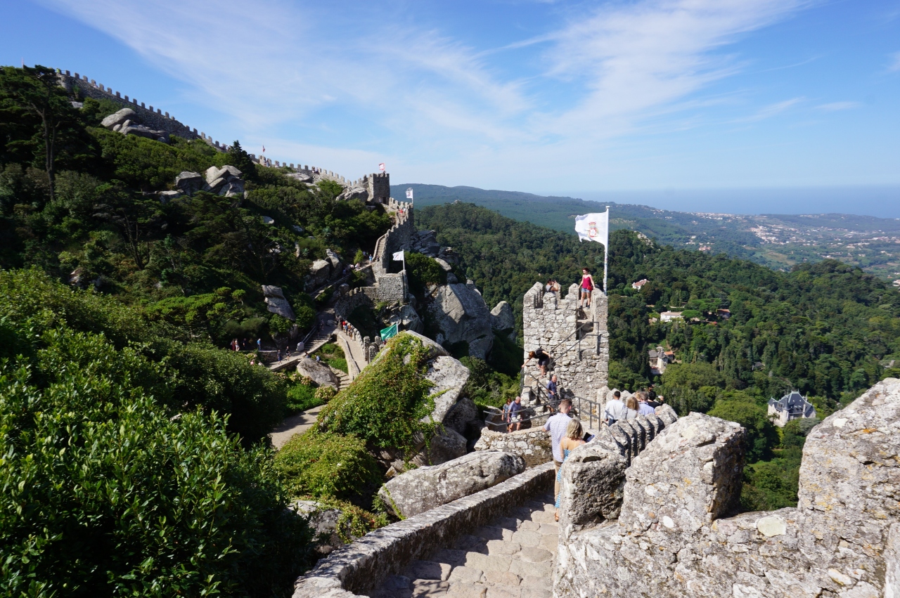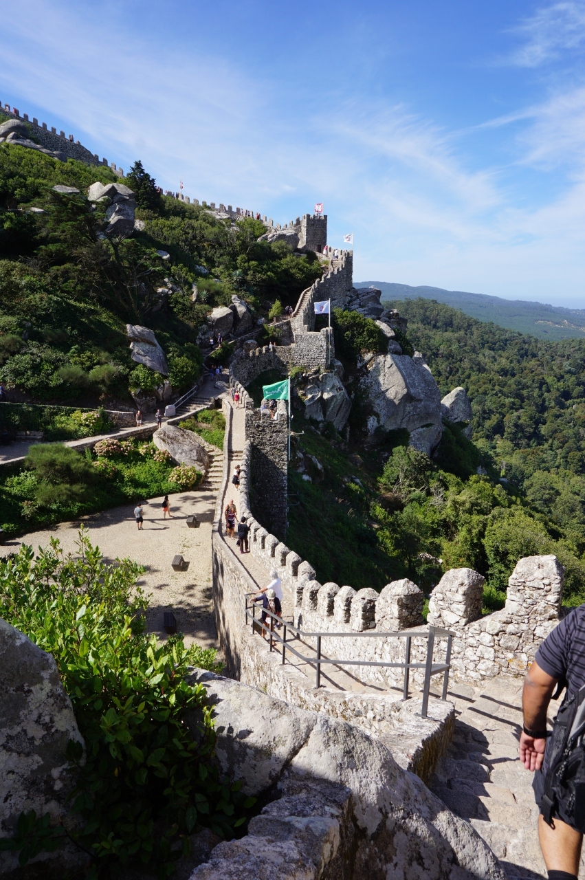 ロシオ駅からシントラ周遊パスの「Bihete Train & Bus」を15EUR、約1,950円で購入して行きました。シントラでは観光客がとても多く、その上、周遊バスに乗車する都度、現金で支払う観光客が多くて、なかなか出発できず、バスも超満員状態でしたので「ムーアの城跡」へ直行しました。この城壁がすごいです。階段ばかりで、登ったり、降ったりの連続ですが、アニメのドラゴンボールに出てくる「蛇の道」みたいと思いました。