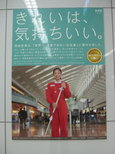 羽田に到着。世界一きれいな空港を支えるお1人。笑顔のポスターでお迎えし...