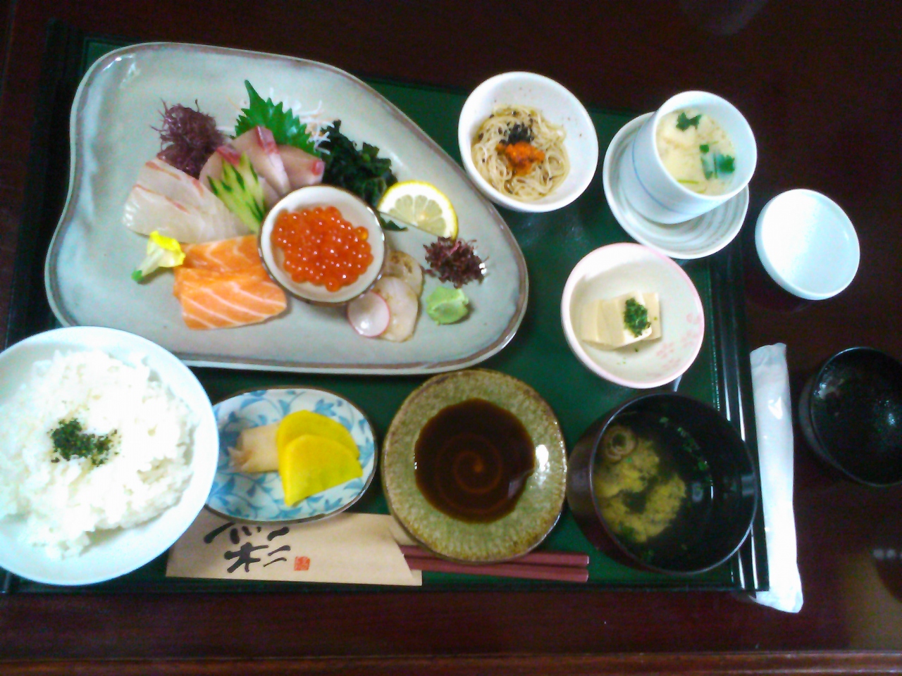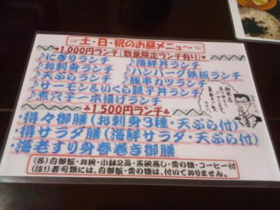 土・日・祝のお昼メニューから、人気の「にぎりランチ」を食べようと思ったら、売り切れでした。替わりに「お刺身ランチ」を選択しました。お刺身はどれもおいしかったけれど、いくらのアルコール臭がちょっと気になりました。・・・といいつつ食べました。