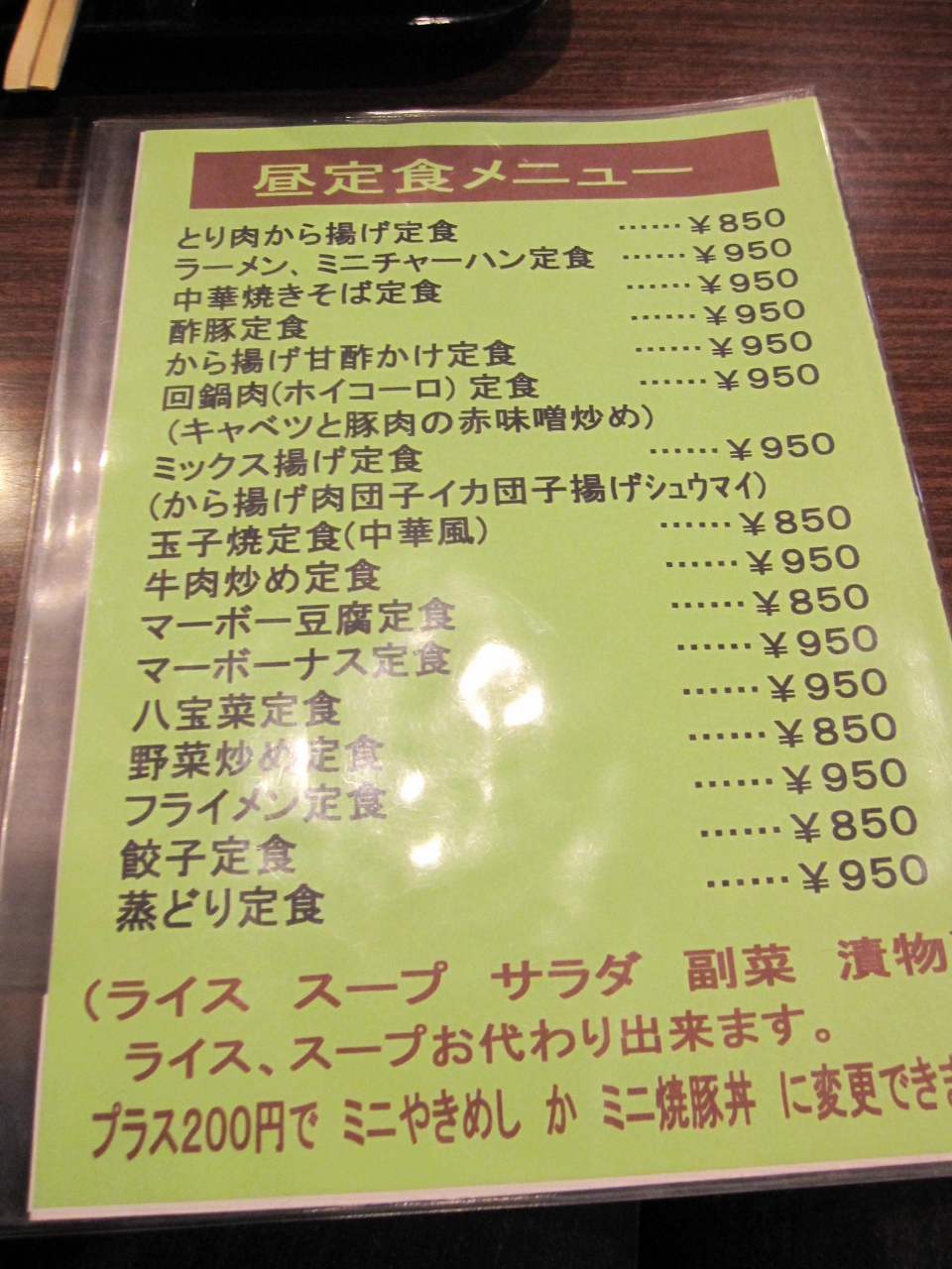 「ランチがお得。から揚げの量すごいで。もちかえりもできるからな。」先輩に勧められて早速足を運んでみました。850円のから揚げ定食が、すごかった。お店の外観は、あっさりしていて、教えてもらわなければ入れなかったかも。住宅街の中の中華料理店で、地元密着型のお店と言う感じです。帰りにメニューをもらいました。こんどはテイクアウトにしてみようかな。