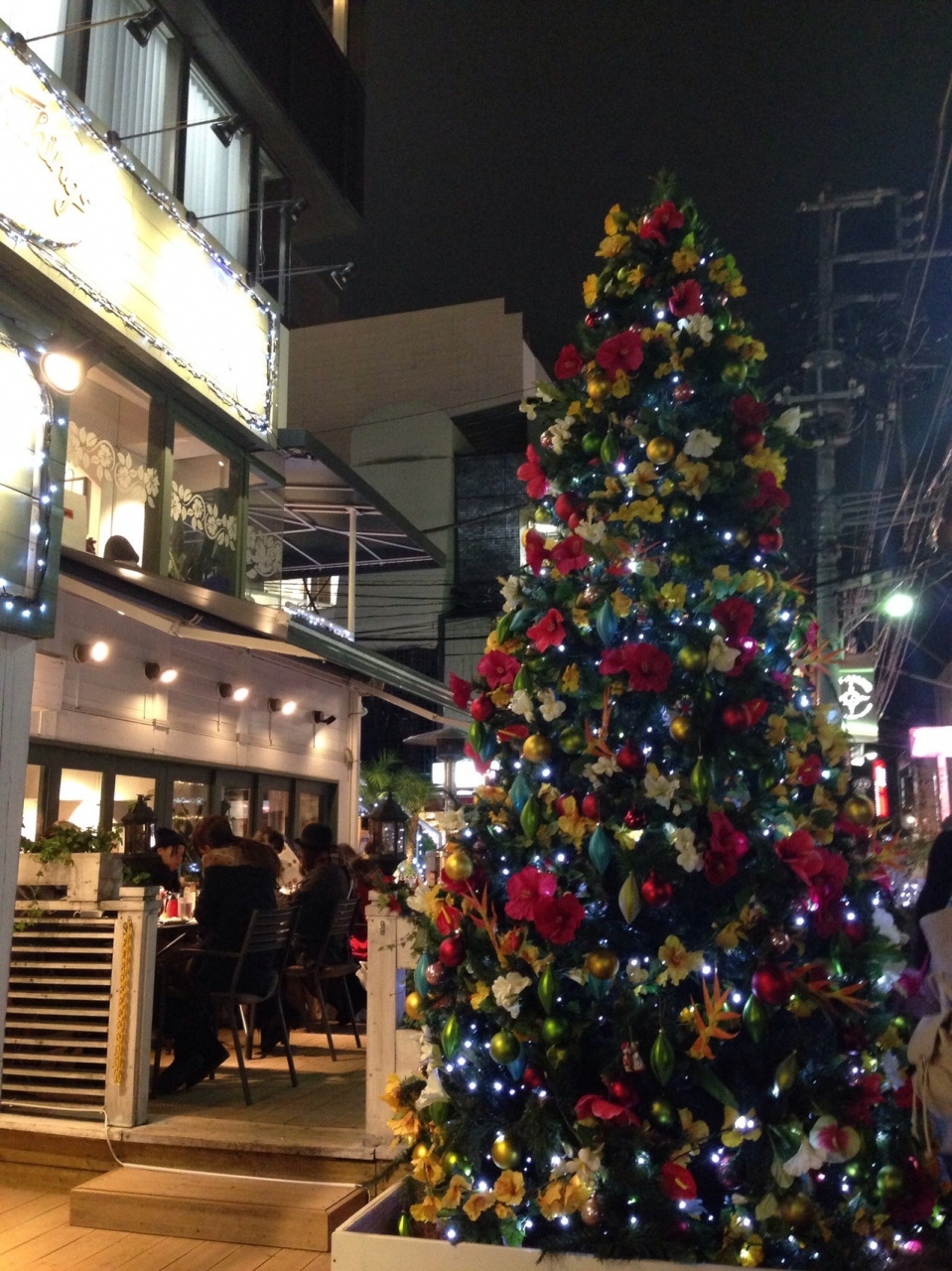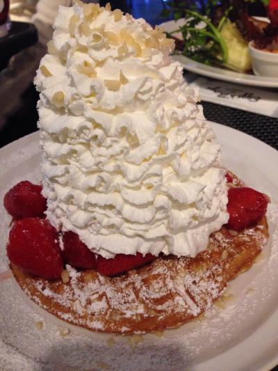 お店の前に飾っているツリーはハイビスカスが飾ってあり、ハワイアン風。私はワッフル。彼はステーキを注文しましたが、どちらも美味しかったです。