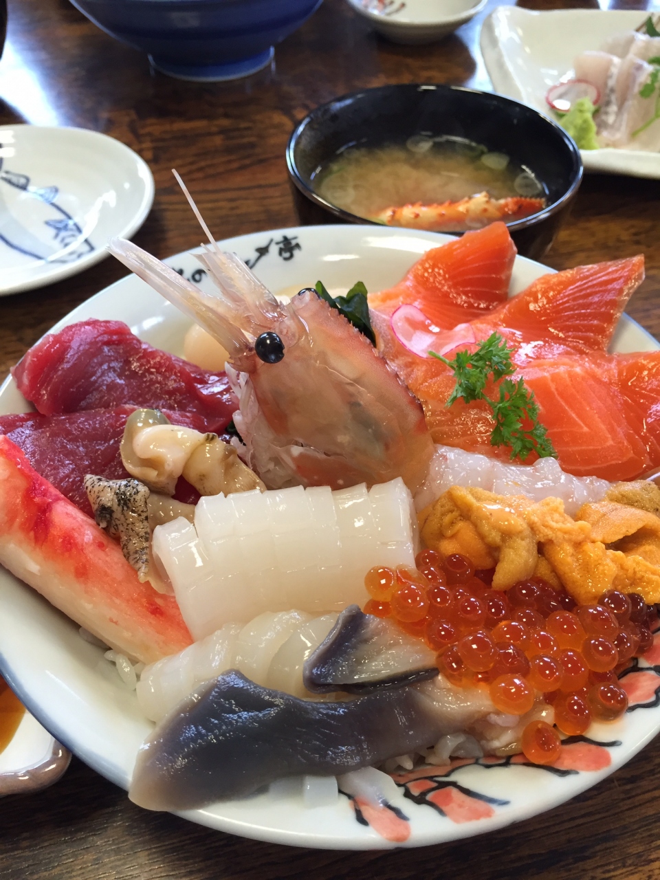 広いので、ゆっくりと舌鼓できます。海鮮丼はお値段はしますが、甘くて、鮮度もボリュームも間違いなし。お店に入る前に蟹汁クーポン頂いたので、付けて貰えました。