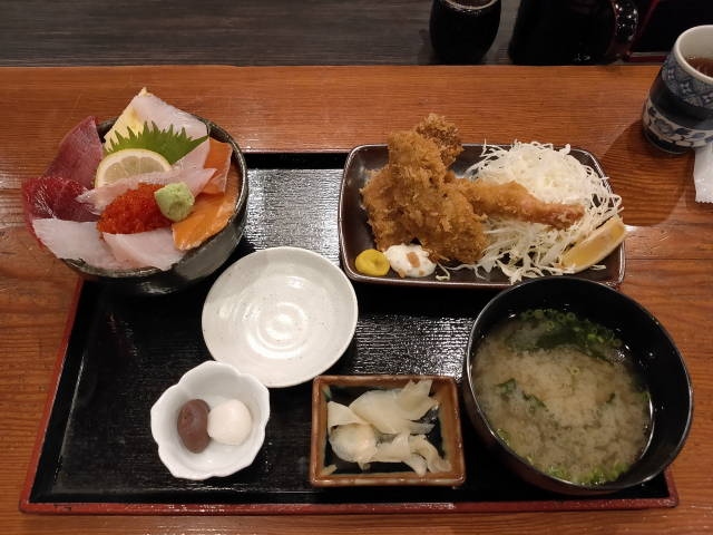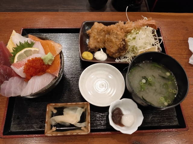 11:00から14:30まで提供される、酢飯を使ったミニ海鮮丼と天ぷらのランチセット。