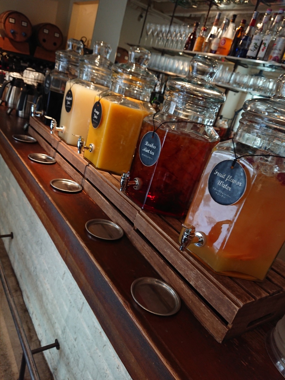 ドリンク、サラダ、パンが食べ放題で、フォトジェニックなドリンクサーバーが並んでいました。