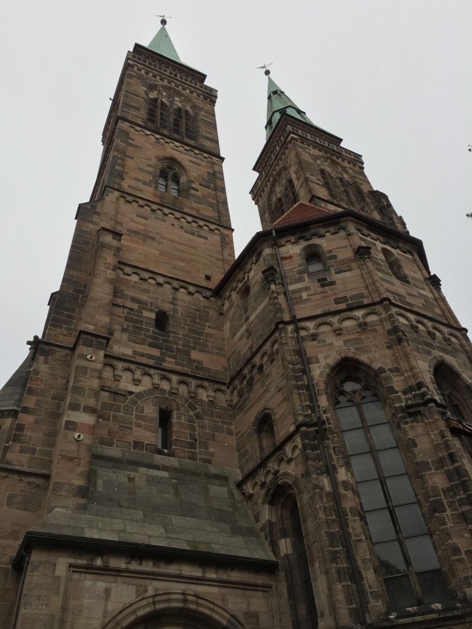 中央広場から北にブルク通りへ入ると聖セバルドゥス教会がある。2本の尖塔が印象的なこの教会です。なので、全体を撮ろうとすると大変。聖セバルドゥスを祀る教会として建設された後期ロマネスク様式の教会です。しかし内部は尖がった感じが特徴のゴシック様式で、14世紀になってからゴシック様式に改装されたそう。