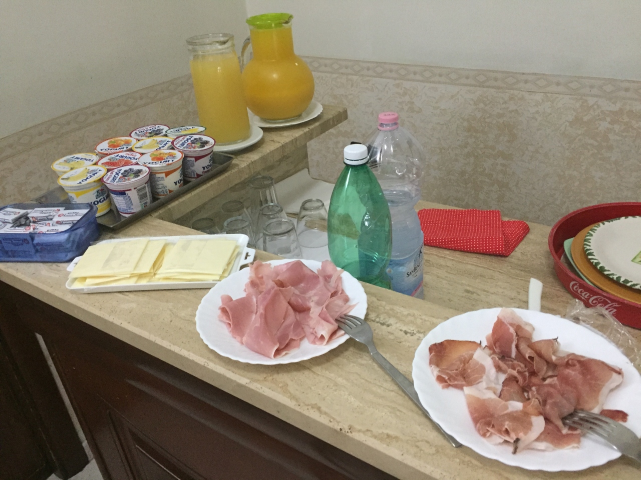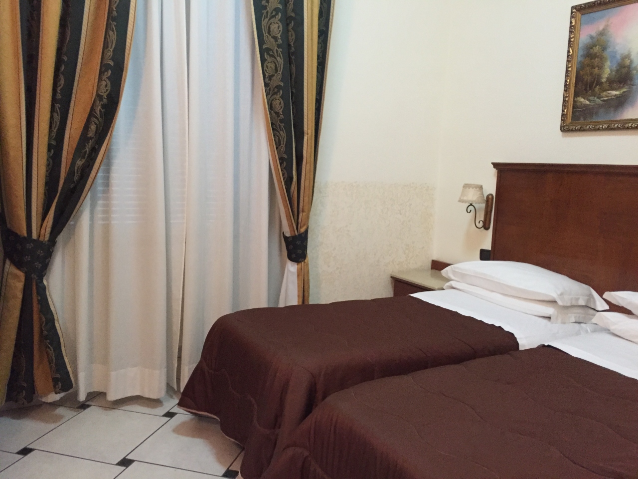 ナポリ中央駅から徒歩4,5分ほど。けど、信号の無い道路を横断するのが一苦労。ホテル自体は古いが掃除はされてる。エレベーターは無く、部屋は狭めで、機内持ち込み用のスーツケースでなんとか広げられる程度。バスタブは無し、固定式のシャワー、トイレの流れがイマイチ。バスタオルは毎日交換してくれる。朝食は、パン3種類、ハム2種類、チーズ、ヨーグルト(4種類)、オレンジジュース、パイナップルジュース、コーヒー、味はまぁまぁ。Wifiは繋がりにくく何度かフロントに連絡して、色々やってくれたけど、結局3泊して最後まで解消されなかった。フロントはフレンドリーで24時間対応。