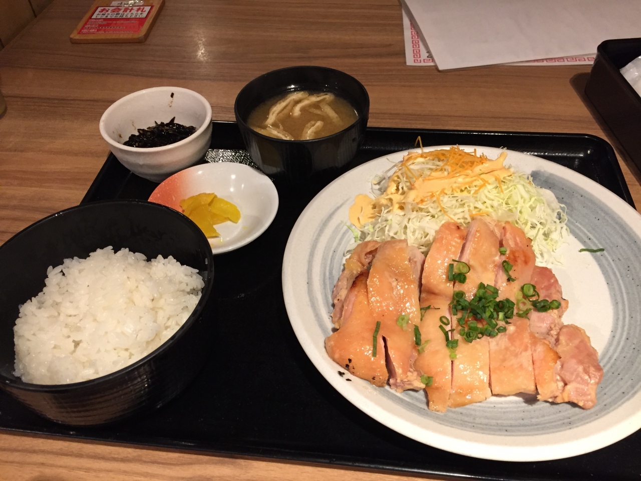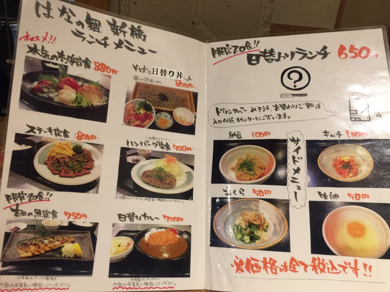 新橋駅 烏森口 徒歩1分。店内は結構広めです。日替わりランチ定食、チキンの味噌焼きを注文しました。ご飯と味噌汁は食べ放題で650円。サイドメニュー納豆やキムチ、オクラなど50円~100円。その他刺身定食やステーキ定食もあります。ドリンクバーもありお得です。