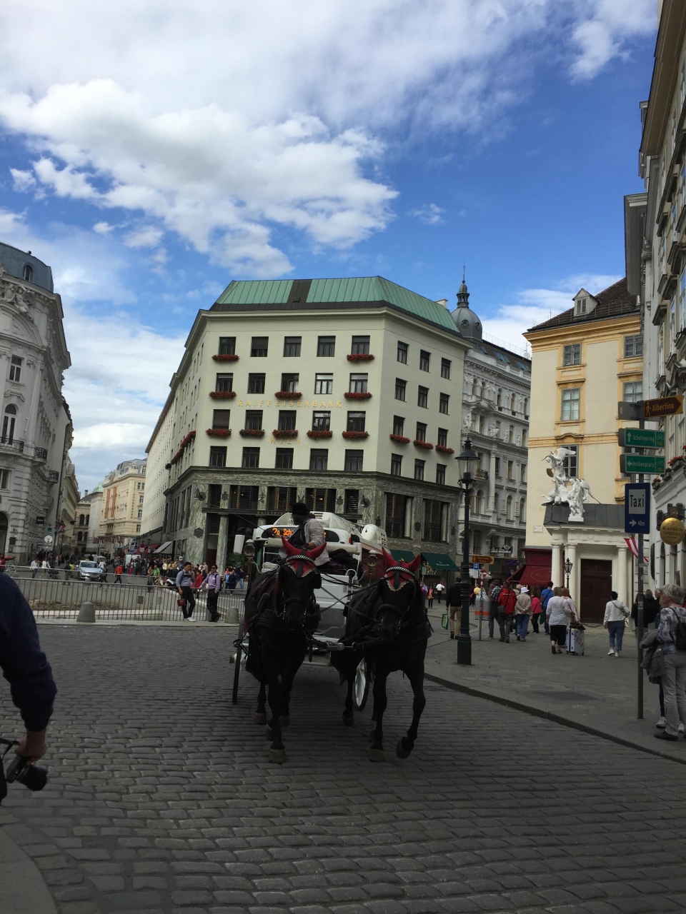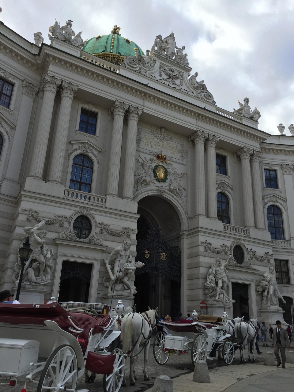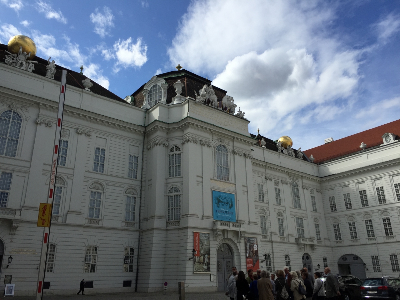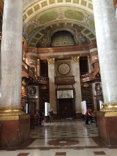 カフェザッハーから歩いて約5分で到着しました。入り口は左側で、宮殿的な階段を上がり…係の人が立っており、ここで自撮り棒をつけていたので、使わないようにと念押しされ、自撮りはしないのでそのままつけていてOKでした。図書館だけど、内部は宮殿のような豪華絢爛で圧巻、天井も素晴らしくそれだけでも満足出来ました。