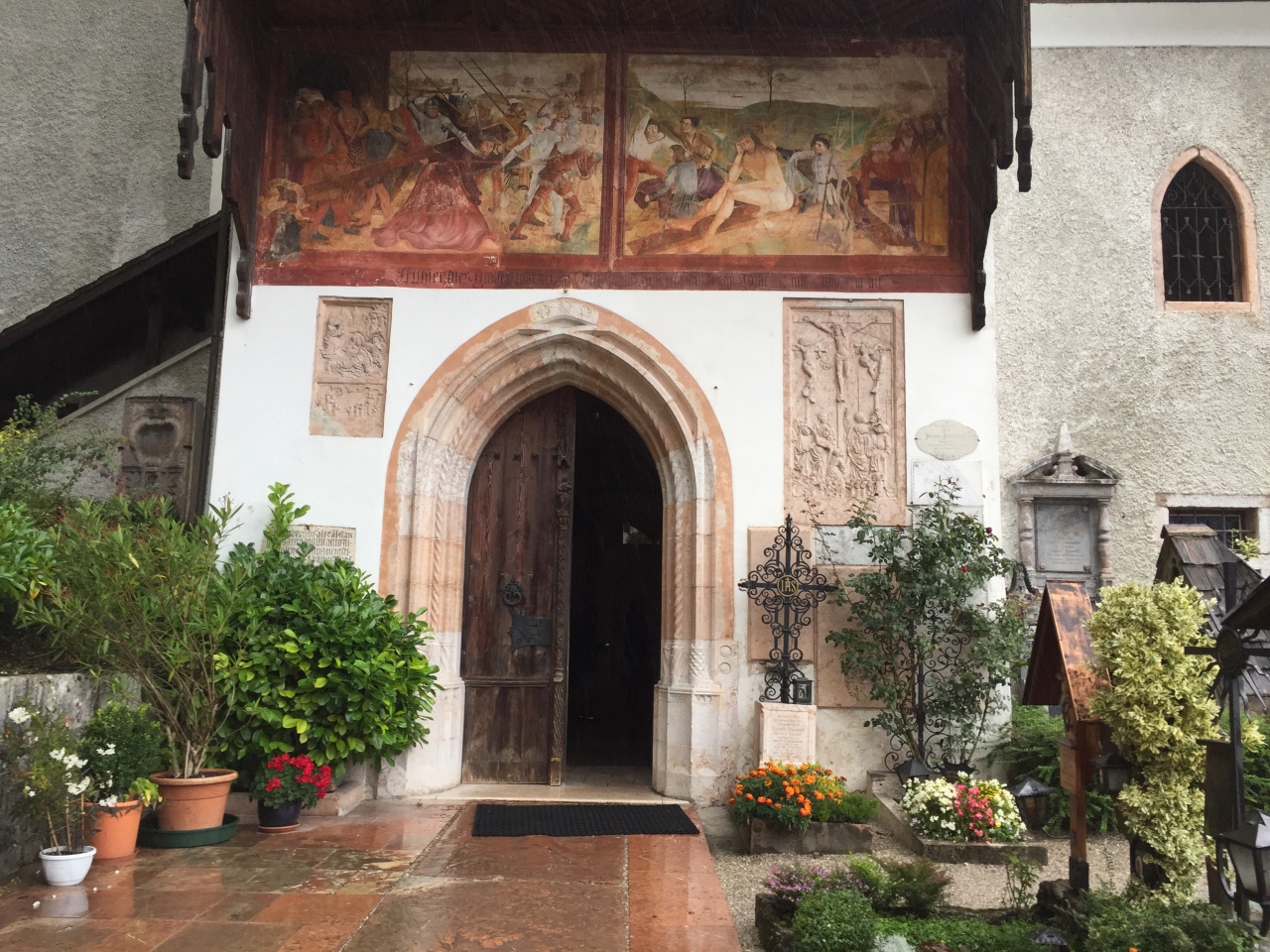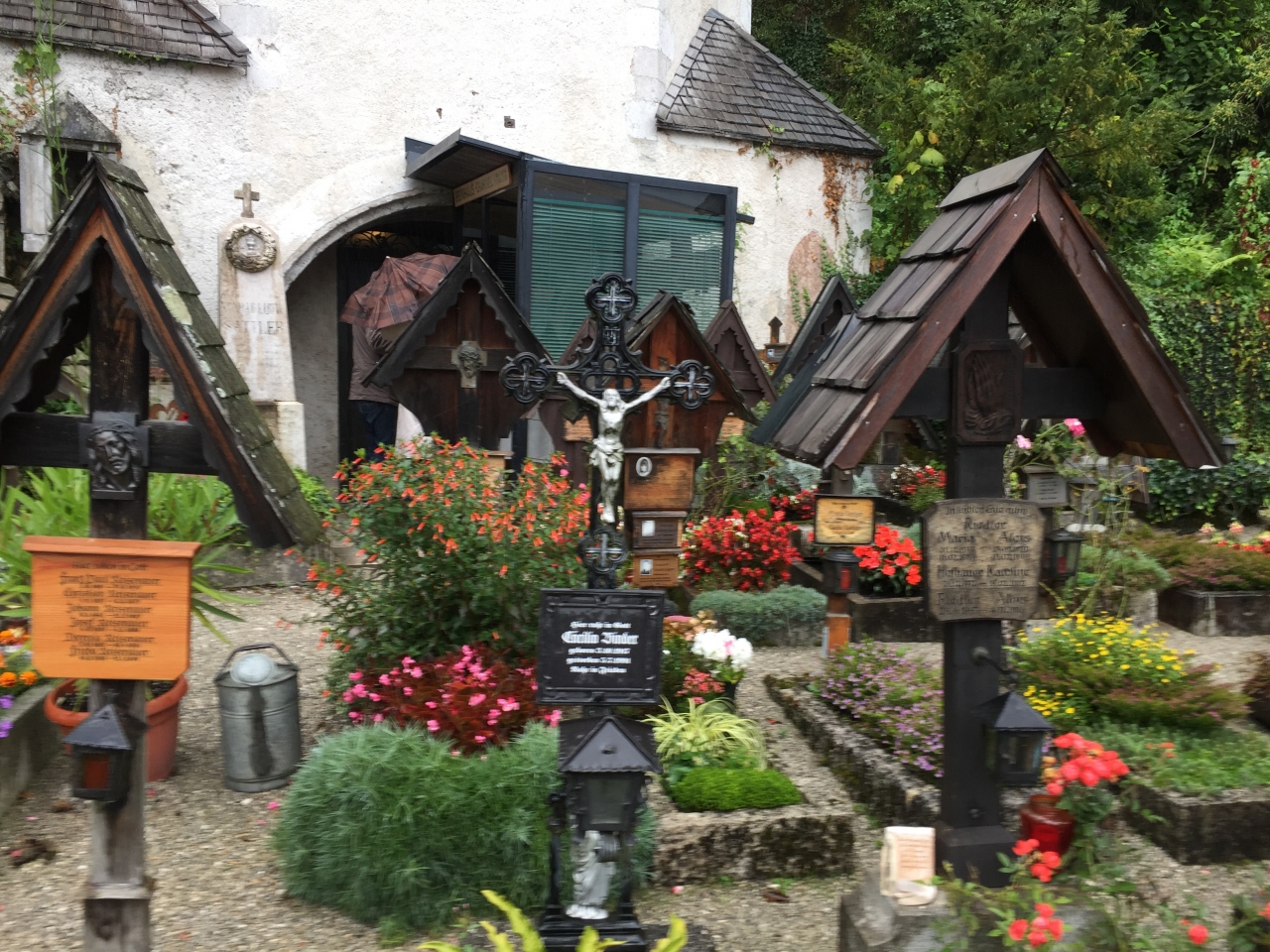 ハルシュタットの高台のカトリック教会。入り口には壁画が描かれていて、中の祭壇がすごく豪華で素晴らしくステンドグラスもステキ。それ以上に凄かったのが墓地です。お花等がカラフルで可愛らしく、そしてそこから見える湖畔は絶景です。