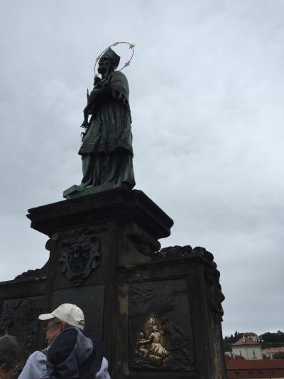 その像の下、台座の部分の銅板に触れると幸運が訪れると云われており、カレル橋を訪れる多くの人が幸運を願って触れていくことでも有名な場所でもあるため、銅板も多くの方に触れられているその部分だけピカピカに光っていました。そういう私も勿論、触ってきました。
